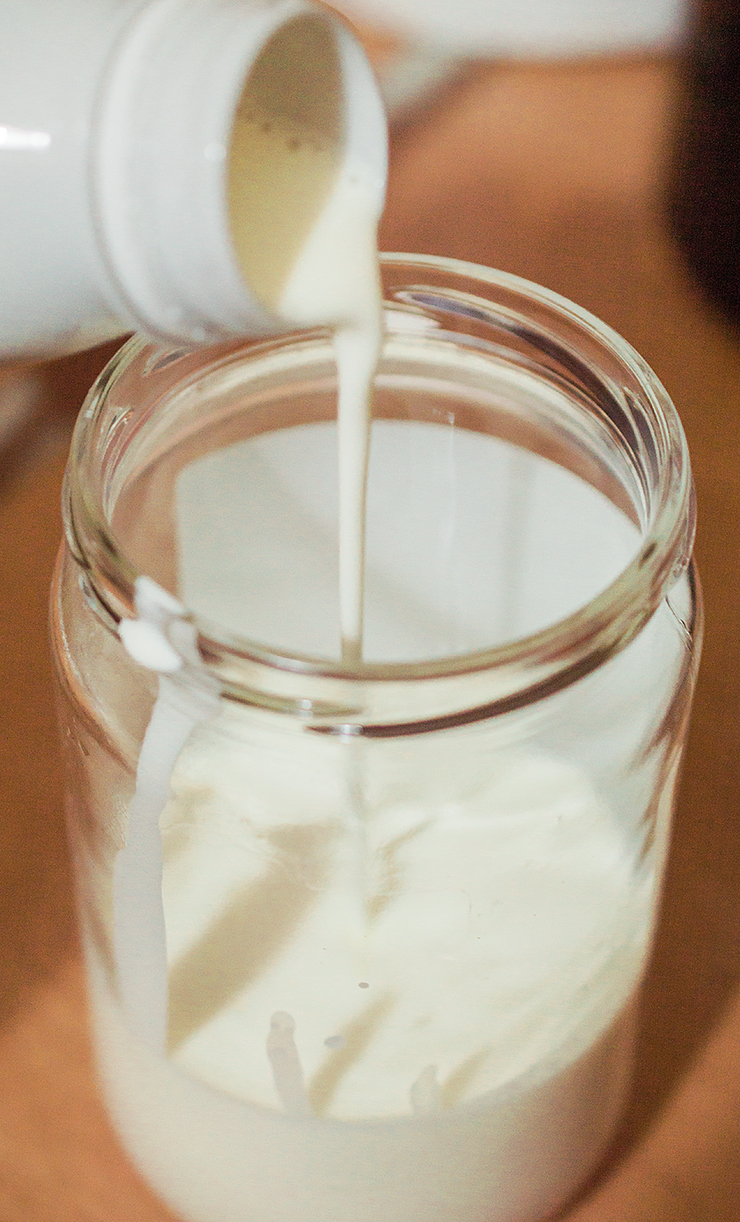 Ρίχνουμε σε ένα βάζο με καπάκι την κρέμα γάλακτος και το αριάνι ή το γιαούρτι μας και ανακατεύουμε καλά.
