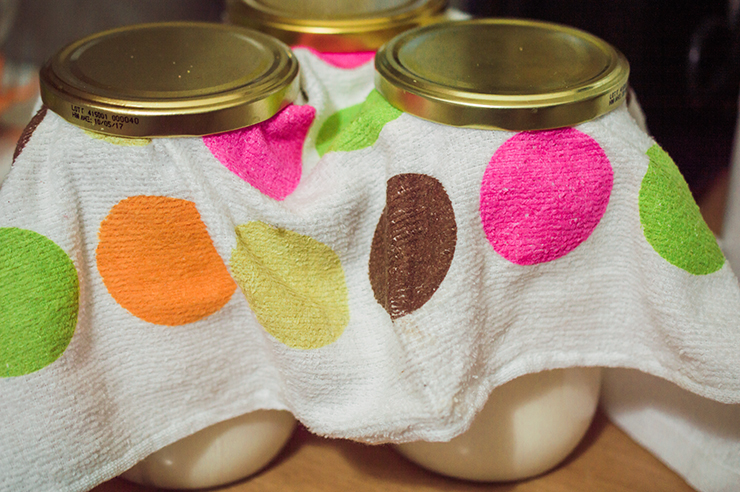 Βάζουμε μια πετσέτα στο στόμιο του βάζου και μετά καπακώνουμε και αφήνουμε σε θερμοκρασία δωματίου για ένα 24ωρο, ανακατεύοντας ανά 8 ώρες.