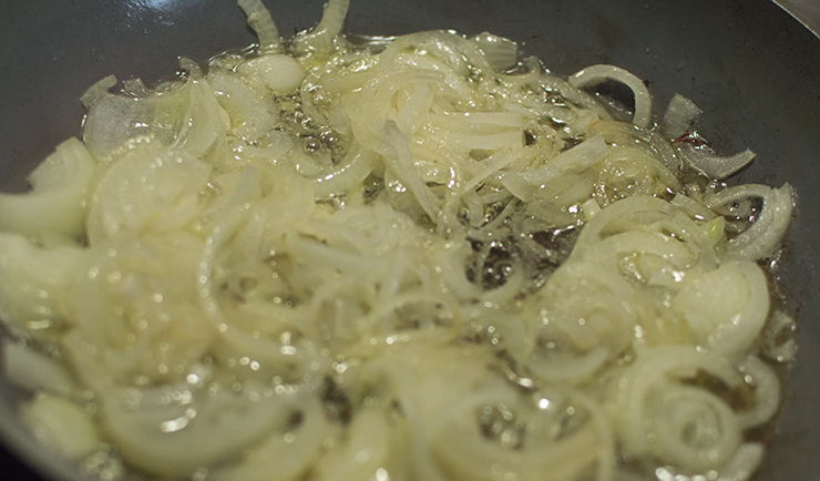 Τα κόβουμε σε λεπτές ροδέλες και τα βάζουμε να "τηγανιστούν" με λίγο κλαριφιέ. Ξεκινάμε με δυνατή φωτία μέχρι να κάψει το τηγάνι μας και με το που ρίξουμε τα κρεμμύδια μέσα χαμηλώνουμε την ένταση στο 2.