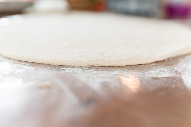 Αφού φουσκώσει η ζύμη (θέλει 30-45' στο περίπου, ίσως πιο λίγο/ πιο πολύ), βάζετε στον πάγκο σας αρκετό αλευράκι, ρίχνετε το ζυμαράκι, κάνετε λίγα διπλώματα με τη σπάτουλα, μετά με τα χέρια σας την κάνετε μια μπάλα, ρίχνετε λίγο αλευράκι ξανά πάνω στη ζύμη και ανοίγετε με τον πλάστη (δείτε στην εισαγωγή).