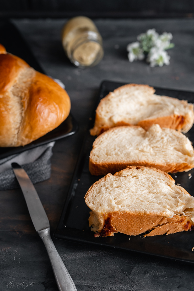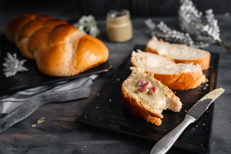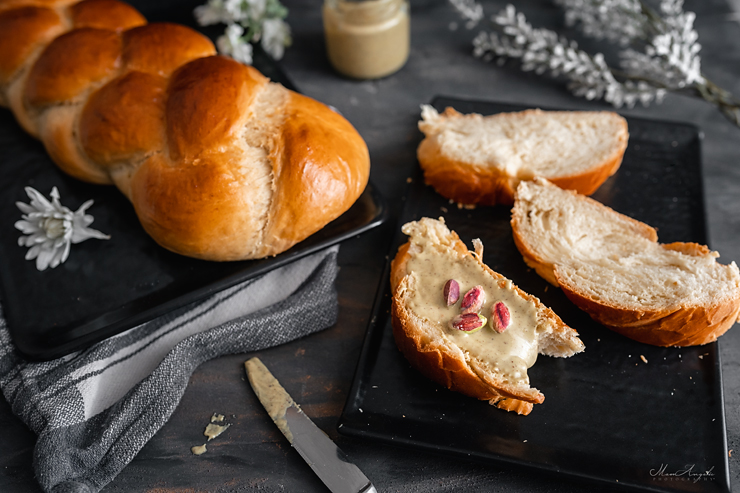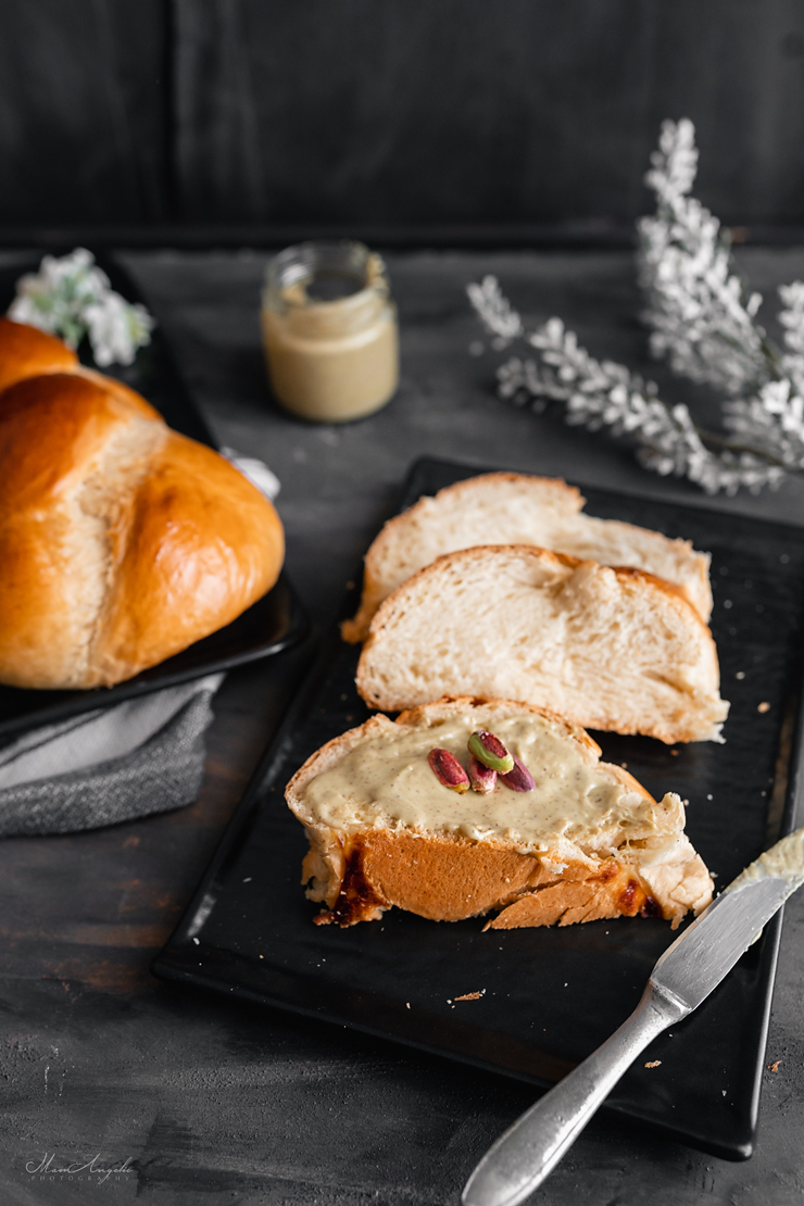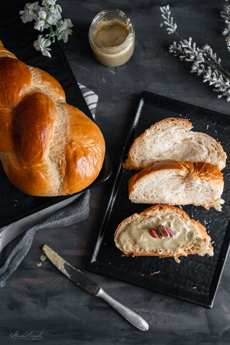 Διαλύουμε τη μαγιά στο γάλα (το γάλα, το βούτυρο και το μαστιχόνερο σε θερμοκρασία δωματίου), τα ρίχνουμε στον κάδο και στη συνέχεια προσθέτουμε όλα τα υπόλοιπα υλικά μαζί και ξεκινάμε ανάδευση.
